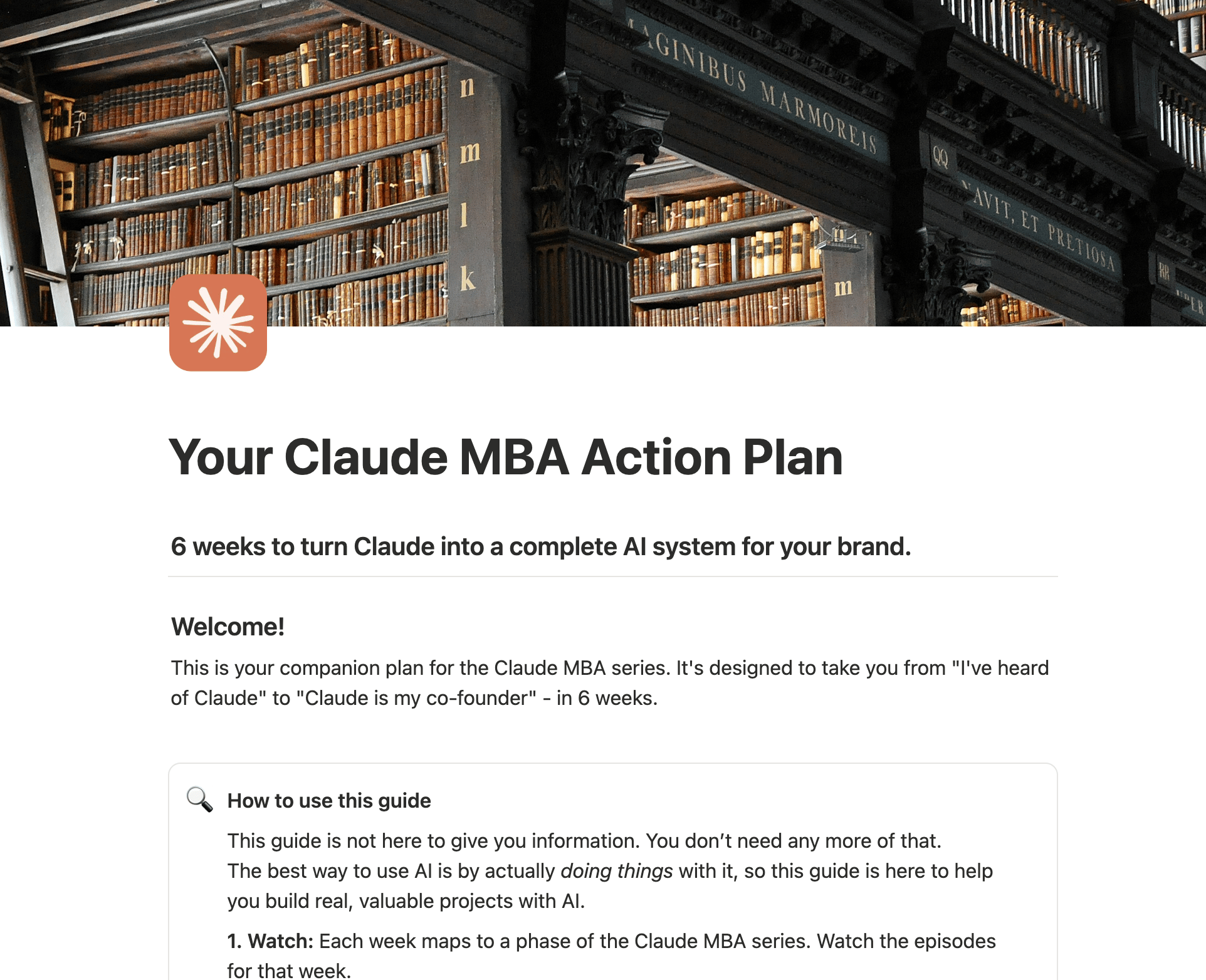 The Claude MBA Action Plan is a free, week-by-week Notion template that walks you through setting up Claude as a real tool for your personal brand and business.